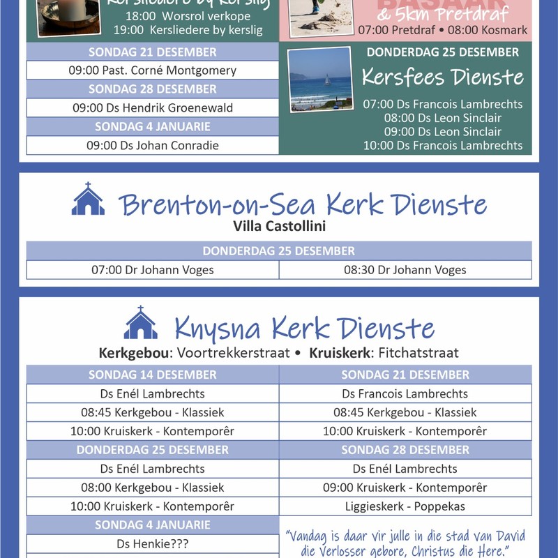 Wat 'n voorreg om te kan bedien in die vakansie. As jy in Knysna is moet jy seker maak dat jy jou kinder stuur. Hier is genoeg vir oud en jonk bring jou gesin.