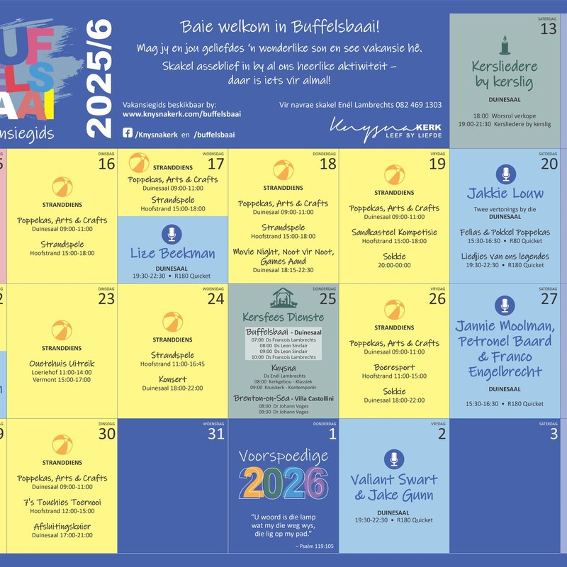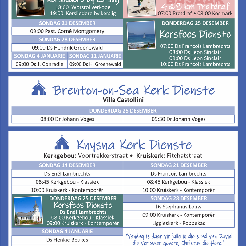 Wat 'n voorreg om te kan bedien in die vakansie. As jy in Knysna is moet jy seker maak dat jy jou kinder stuur. Hier is genoeg vir oud en jonk bring jou gesin.